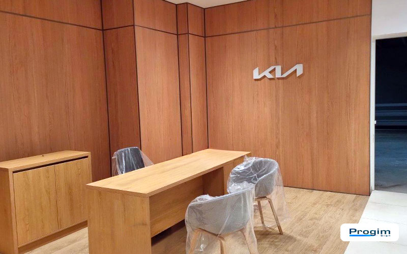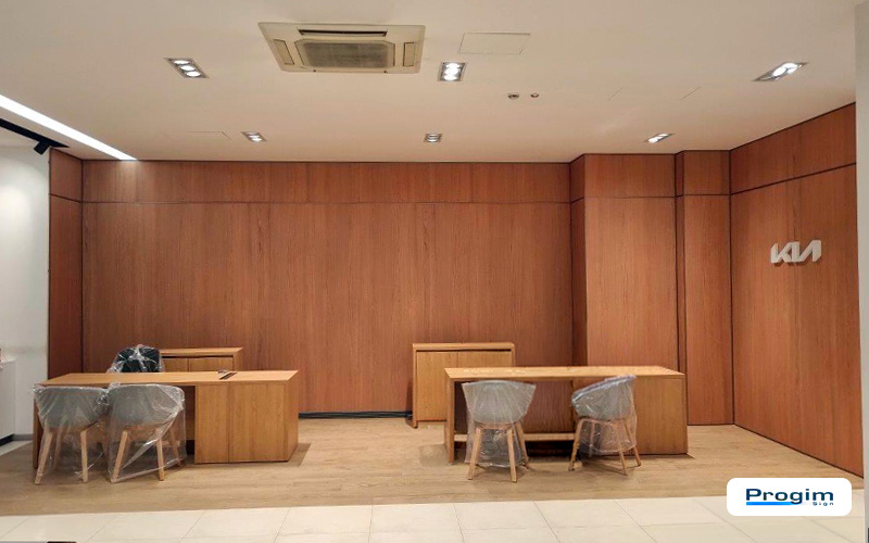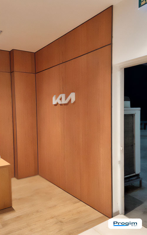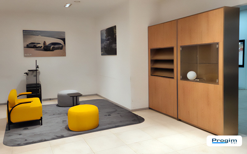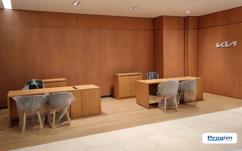 Uno showroom funziona quando tutto “sta insieme”: percorsi chiari, punti di accoglienza leggibili, materiali che non si contraddicono. Per la sede KIA Conero Car di Civitanova Marche, Progim Sign ha gestito un intervento interno mirato, concentrato su due componenti che cambiano subito la lettura dello spazio: arredi e pareti effetto legno.