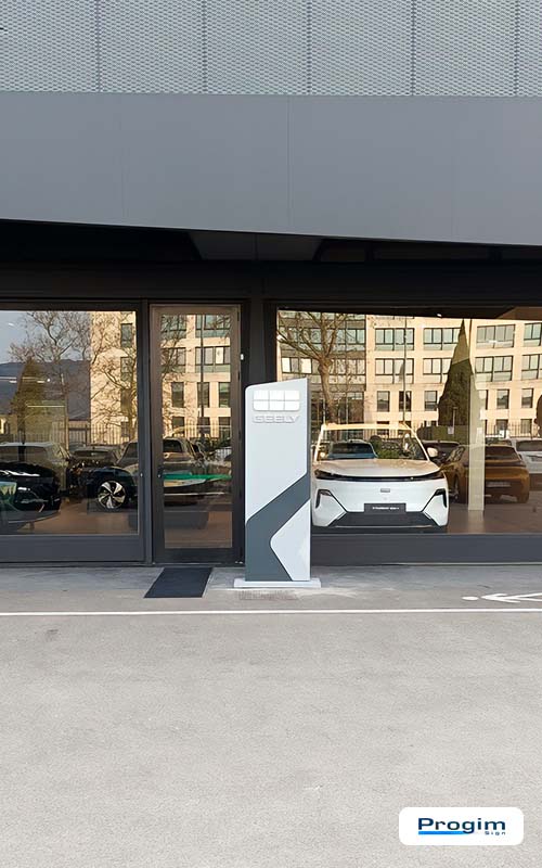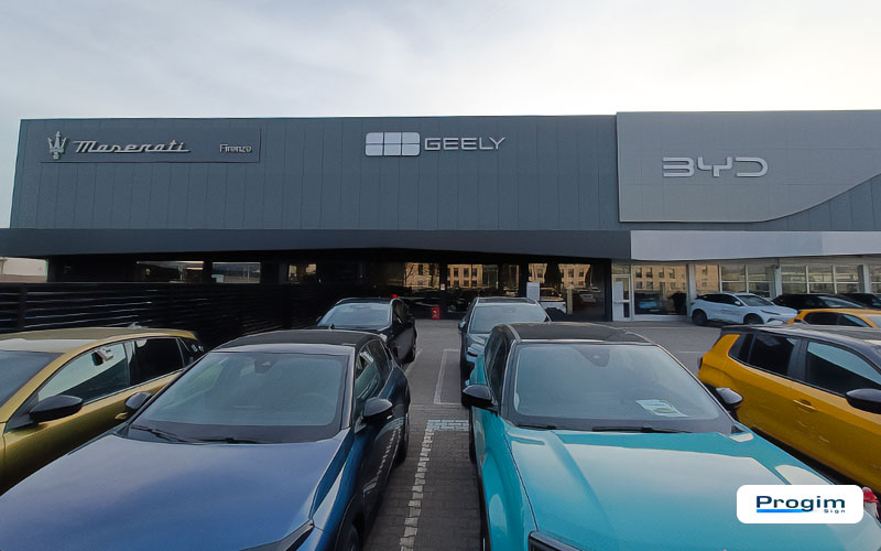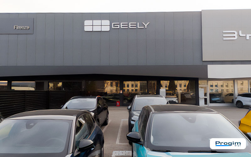 Per la sede Car Village di Sesto Fiorentino, il lavoro sviluppato per Geely – Jameel Motors si muove proprio su questo piano. L’obiettivo era costruire una presenza esterna ordinata, capace di chiarire gli accessi e di dare una lettura più netta alle funzioni del sito, senza sovraccaricare l’insieme.