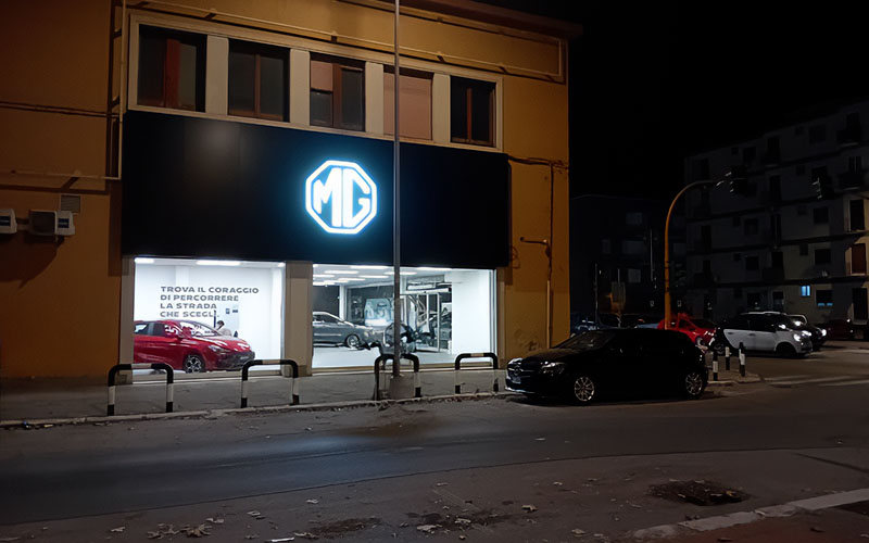 Per la sede di Maldarizzi Automotive Bari, MG Motor Italia ha richiesto un aggiornamento dell’immagine esterna coerente con le linee guida del brand, con particolare attenzione alla visibilità su strada e alla leggibilità del marchio. Progim Sign ha seguito l’intervento: rilievi tecnici, progettazione grafica e produzione/posa degli elementi identificativi, garantendo tempi, qualità e coerenza visiva.