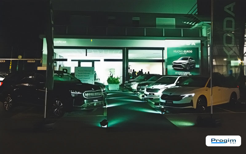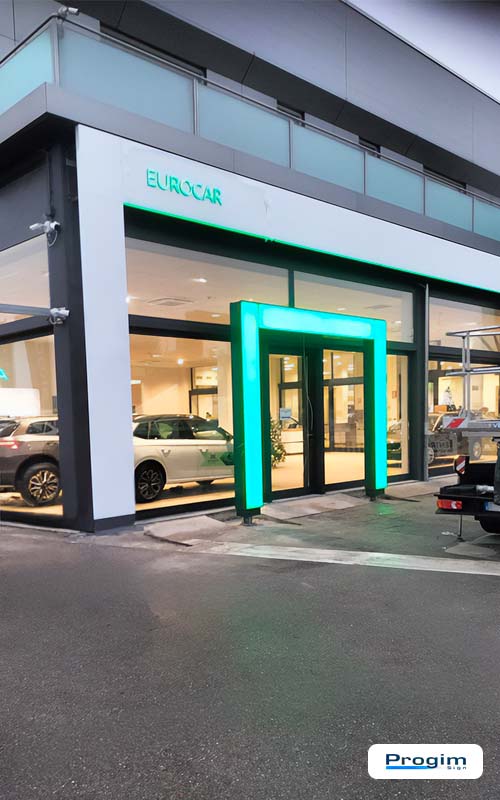 • Ingresso concessionaria Škoda con portale luminoso verde e facciata Eurocar, elemento distintivo realizzato da Progim Sign.