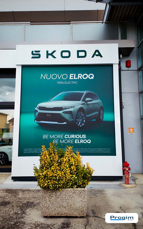 • Communication wall Škoda con grafica Nuovo Elroq 100% electric, elemento di comunicazione esterna installato da Progim Sign.