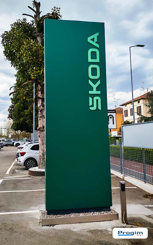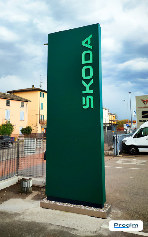 • Totem verticale Škoda con logo retroilluminato per visibilità su strada, struttura realizzata da Progim Sign.