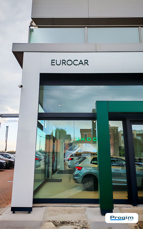 • Dettaglio ingresso Eurocar con vetrata showroom e portale architettonico Škoda, intervento a cura di Progim Sign.