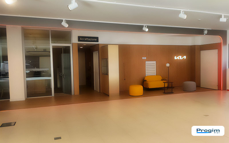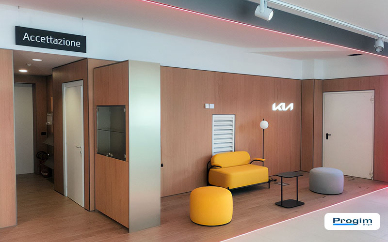 • Illuminazione LED perimetrale e rivestimenti interni showroom KIA Autotorino Valmadrera, intervento di rebranding a cura di Progim Sign.